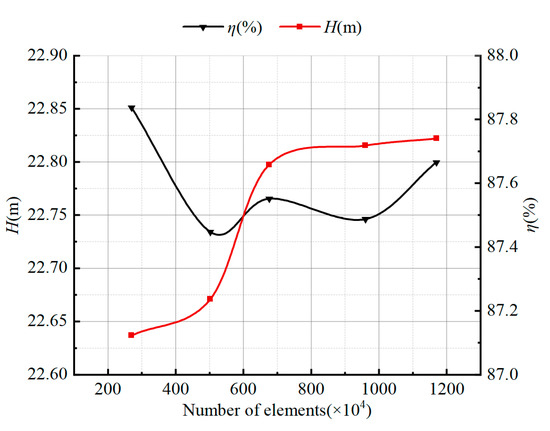 A total of 5 sets of independent meshes with element counts of 2.7 million, 5.02 million, 6.76 million, 9.6 million, and 11.7 million were generated. The results of efficiency and head calculation for the 5 sets of meshes are shown in Figure 2, in which the efficiency curve fluctuates, but the magnitude is not significant and the head curve does not increase significantly after the count of elements reaches 6.76 million. After comprehensive consideration, the third set of meshes was used for subsequent calculations. Part of the mesh is shown in Figure 3, and the number of elements in each domain is shown in Table 3.