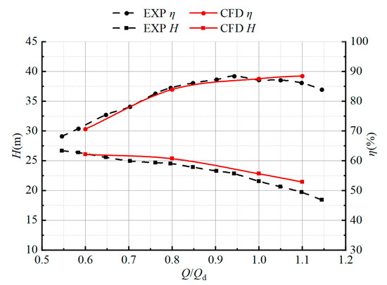 The comparison of the performance curves obtained from the numerical calculation and the experimental results is shown in Figure 4. The trend of the calculated curve and the test curve was very similar; the calculated efficiency was 87.55% under the design condition and the test efficiency was 87.12%, with a difference of 0.43%. This indicates that the numerical calculation results were accurate.