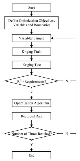 The overall optimization process in this paper is shown in Figure 5. Firstly, the optimization objective, design variables, and their range were determined. Next, multiple sets of data were randomly selected from the design space and divided into two parts, one for model training and the other for model testing, without duplication between the two parts. In the next step, R2 was calculated based on the training and testing results, and if it met the accuracy requirements, the optimal value of the model was found using the optimization-seeking algorithm and the data were recorded; otherwise, the data were sampled again to train the model. The above process was repeated several times, and finally, the optimal result was selected as the optimization result output, and the process was finished.
