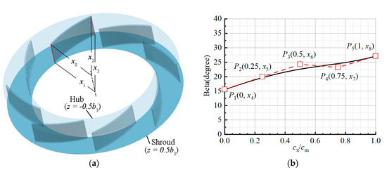 BladeGen was used to complete the parameterization of the diffuser model. In BladeGen, the vane angle curves in the hub plane and shroud plane were fitted with 4th-order Bessel curves to achieve parametric control of the diffuser vane geometry. According to engineering experience, the vane angle, as well as the leading and trailing edges, had a large impact on the performance. A total of 14 design variables, numbered x0–x13, were chosen to achieve fine control of the vane shape when combined with the BladeGen software parametric modeling method. Among these variables, x0 and x1 were the distances from the intersection of the leading edge of the diffuser vane with the hub plane and the shroud plane to the central axis of the diffuser, respectively, and x2 and x3 were the distances from the intersection of the trailing edge of the diffuser vane with the hub plane and the shroud plane to the central axis of the diffuser, respectively, as shown in Figure 6a. Variables x4–x8 showed the y-coordinate values of the 5 Bezier curve control points in the hub plane, as shown in Figure 6b. Variables x9–x13 showed the y-coordinate values of the 5 Bezier curve control points in the shroud plane, with the same graph as the hub plane. The x-coordinates of each Bessel curve control point were evenly distributed and fixed, and the upper and lower boundaries of each design variable are listed in Table 4.