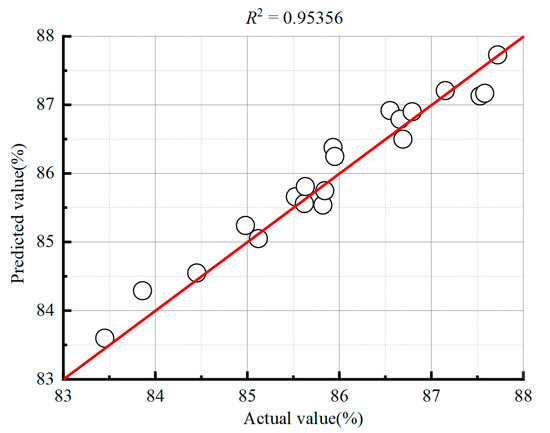 The R2 analysis method was used to evaluate the prediction accuracy of the model. The evaluation results are shown in Figure 7. It can be seen that the predicted value had good consistency with the actual value, the prediction accuracy was high, and the R2 value was 0.95356, which meets the engineering application standard. The R2 calculation formula is as follows: