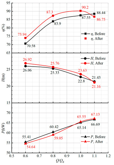 Figure 9 demonstrates the hydraulic performance curves of the optimized model compared with the original model in all working conditions. The efficiency under design conditions and part-load conditions was greatly improved. The efficiency was improved by 3.36% and 3.4% under 0.6 Qd and 0.8 Qd conditions, respectively, by 2.65% under design conditions, and the high efficiency area was widened. Meanwhile, the efficiency decreased under the over-load condition 1.1 Qd, but only by 1.69%, so the efficiency of the optimized model can still be considered to have substantial improvement. Similarly, the model head also had a substantial increase under the design condition and part-load condition. Head under the design condition was increased by 0.83 m, while the high flow condition was slightly reduced. The model power decreased under the part-load condition and the design condition and over-load condition were consistent with the original model, indicating that the optimized model had better hydraulic performance and lower energy consumption, which ultimately achieved the goal of optimization.