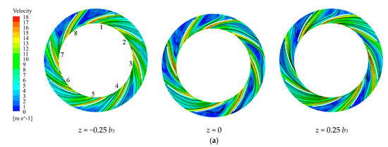 Figure 10 showed the velocity distribution and streamlines within the diffuser in different z-planes, respectively. For the convenience of description, the flow paths between the diffuser vanes were numbered from one to eight in a clockwise direction, respectively. It can be seen that the original model (Figure 10a) had a wide range of low-speed areas and vortex areas in the flow path, and these vortices blocked the flow path and seriously affected the performance. In the z = −0.25 b3 plane, the low-speed area was mainly distributed in the middle and outside of runners three and seven, outside of runner four, in most of runner eight, and there were also small low-speed areas outside of runner six. Most of these low-speed areas were near the back of the vane where the streamlines began to spread out and the flow separation phenomenon occurred. In runner eight, where the flow separation was most severe, the annular streamlines on the outside indicate that a vortex had developed in this area. The situation in the z = 0 plane was more severe, except for the runner five, which was good, the rest of the runners near the back side of the vane had a wide range of flow separation and vortex phenomenon. The streamlines on the outside of runners one and two turned at a large angle and extended along the outer circle of the diffuser, indicating that the flow in the volute on the outside of the diffuser was also not optimistic. The z = 0.25 b3 plane was slightly better than the z = 0 plane, the streamlines in runners one and five were more satisfactory, while the rest of the runners also had flow separation and vortex phenomenon. These low-speed areas had a common feature, their locations were located in the runner near the back side of the vane.