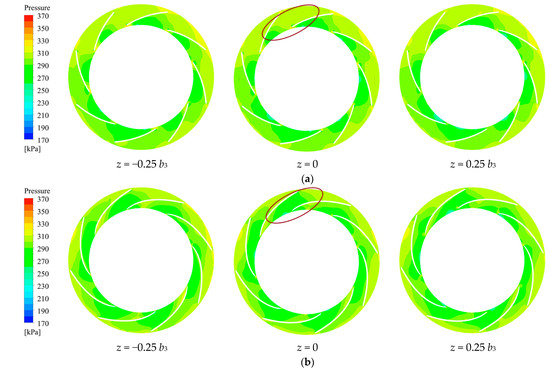Figure 11 shows the pressure distribution in the diffuser in different z-planes. The pressure distribution between different planes was slightly different, but the difference was not significant. The pressure distribution grew gradually throughout the flow channel from inside to outside in the original model, with the blade working surface pressure being greater than the back, and the leading edge seeming high-pressure point due to direct fluid impact. Comparing the optimized model (Figure 11b) with the original model (Figure 11a), the pressure gradient variation in the diffuser of the optimized model was reduced, which was beneficial to pressure recovery and reduced energy loss. The point with high pressure disappeared because the vane leading edge became thinner and the intensity of direct impact by fluid was reduced.