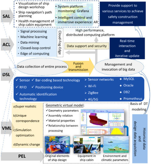 - DT-based models need to design the applicable algorithm to realize the process management function of different ship industry periods. They include signal processing, machine learning, data fusion and mining, closed-loop control and other algorithms to achieve ship industry processing quality analyses, fault diagnosis and prediction, equipment health management, resource optimization, job shop scheduling and energy consumption. Therefore, an understanding of how to better develop the relevant prediction algorithm will be a future focus of technical challenges.