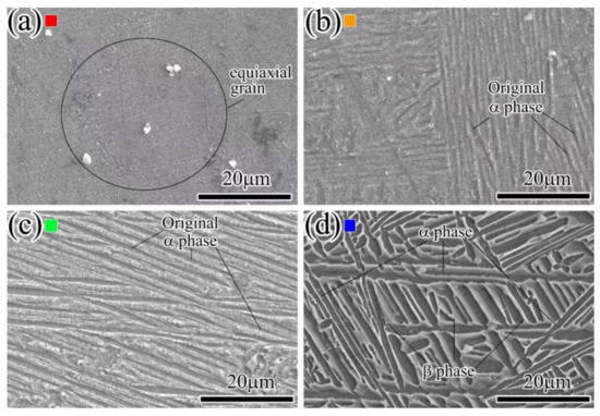 Figure 3 shows the microstructure photos of different zones in the IFW joint obtained by SEM. In the BM shown in Figure 3d, a typical basketweave structure formed by quasi-β forging process of TC21 alloy and consisting of α + β two phases (black color α phase and white color β phase) is observed. After quasi-β forging of the TC21 alloy, the primitive β grains are destroyed in forging deformation, and the α phases at the β grain boundary are kinked or spheroidized and distributed in chain shape. Moreover, the lamellar α phases inside the β grain boundary are cross-distributed with each other and woven into a basket shape [18]. The width of most lamellar α phases (hereafter called “BM original α phase”) are measured with ranges of 1–4 μm. Figure 3a displays the microstructure of the WZ. It is observed that the basketweave structure and BM original α phase have completely disappeared. Moreover, the shape of fine equiaxial β grains with a size of 20–30 μm are found due to dynamic recrystallization. The size of recrystallized equiaxial β grains in the WZ is much smaller than the mean size of equiaxial β grains in the BM, which spans hundreds of micrometers. In the WZ, a great deal of heat is generated by friction with high-speed rotation during the IFW process and causes the temperature (≥1200 ℃) exceeding the β-transformation temperature (970 ± 20 ℃) of TC21 alloy [15,19]. As a result, dynamic recrystallization happens in the WZ. In addition, severe plastic deformation occurs in the WZ during the IFW process. Because of the large deformation and resultant large distortion energy, the number of nucleation sites increases greatly during recrystallization. According to recrystallization theory, the recrystallized grain size is determined by the short axis of the elongated grains [20]. Therefore, the size of recrystallized equiaxial β grains in the WZ is much smaller than that of the equiaxial β grains in the BM. Figure 3b,c show the microstructure of the TMAZ and HAZ, respectively. There is no fine equiaxial grain observed in the TMAZ and HAZ, indicating that no recrystallization occurred in the TMAZ and HAZ because the temperature is lower than β-transformation temperature [21,22]. It can be found that BM original α phases partially remain in the TMAZ and completely remain in the HAZ.