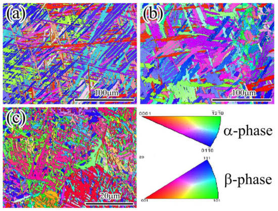 EBSD micrographs of different zones of the IFW joint are shown in Figure 5 to illustrate the feature of crystal orientation. As shown in Figure 5a, in the BM, each lamellar α phase does not exist independently. Instead, a series of lamellar α phases with the same crystal orientation exist together and form a cluster. However, the crystal orientations for different clusters are different. It is revealed that α phase clusters with different crystal orientations are cross-distributed with each other and woven into a basketweave structure. Due to this kind of cross-woven structure, TC21 base material has excellent comprehensive properties. Figure 5b displays the EBSD mapping of the TMAZ. It is observed that the grain boundaries between lamellar α phases in the same orientation cluster have become indistinct and the lamellar α phases in the same cluster adhere together, which means the basket weave microstructure existing in the BM has been destroyed in the TMAZ due to the high heat and friction force conditions. Because of the very fine grain size of the WZ, we could hardly obtain any useful information when using the same EBSD scan step with the BM and TMAZ, so we reduced EBSD scan step gap in the WZ. Figure 5c depicts the EBSD micrographs of the WZ after reducing the scanning step gap. It is found that a series of fine lamellar α phases formed by recrystallization also have the same crystal orientation, but the range of lamellar α phases with the same crystal orientation is obviously smaller than that in the BM, and no basket weave structure is formed in the WZ.