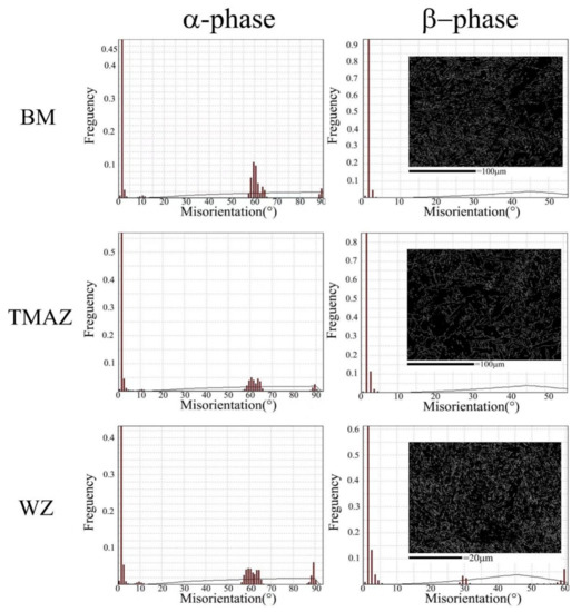 Figure 6 shows misorientation angle distribution the of grain boundary for the different zones of the IFW joint. On the right side of Figure 6, distribution mappings of the grain boundary in the different zones are also correspondingly displayed. It is shown that the number of grain boundaries of the WZ are the largest, revealing that the grain refinement degree is very high in the WZ. However, grain boundaries of the BM look more like those of the TMAZ, which is believed that the reason is the scanning step gap of 0.4 m is chosen too large for the refined phases of the TMAZ, and the fine α phase boundary cannot be recognized. From the misorientation angle distribution of β phase for different zones shown in the right part of Figure 6, it could be found that β phases with a large angle boundary of 30° and 60° appear in the WZ, but do not appear in the TMAZ and BM. This is observed because only dynamic recrystallization takes place in WZ and a lot of fine equiaxial grains are formed, which possess large angle grain boundaries. As shown in the left part of Figure 6, there is no significant difference for the misorientation angle distributions of α phase in the different three zones of the IFW joint. In the BM, α phases exist in the form of cross-woven basket structure, so there are large-angle grain boundaries of around 60° as well as small angle grain boundaries. However, the obvious difference for the three joint zones is that there are more large-angle grain boundaries near 90° in the WZ than in the TMAZ and BM. It is believed that the rapid temperature decreasing in the WZ results in more large-angle grain boundaries close to 90° to remain.