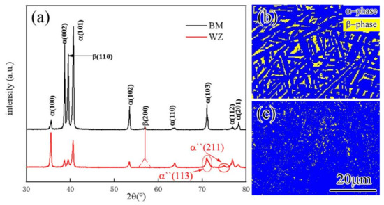 Figure 7a plots XRD patterns of the BM and WZ zones of the IFW joint. Most of the peaks in the XRD patterns are similar to the report from Wu and Yuan et al. [15,23]. From Figure 7a, we can find the XRD peaks in the WZ have obvious broadening trend comparing with the peaks in the BM, suggesting that the grain size of the WZ is smaller than that of the BM, and this result is also consistent with the SEM observed microstructure. The three strong peaks of α-phase in the BM are located at (101), (002) and (103) peak, instead, the three strong peaks in WZ are changed to (100), (101) and (103) peak. Moreover, the peak relative intensity of (100) α-phase increases the most in the WZ zone, indicating that (100) crystal orientation is dominant after IFW process. In addition, it can be found in the pattern of the WZ that there are two “Abnormal peaks” located at about 72°and 75°, respectively. The peak at around 72° is an abnormal broadening peak corresponding to the (103) α phase, which is believed to be caused by the peak superimposition of normal (103) α phase and residual (113) α” phase. Another peak at about 75° is a strange and very small peak that does not conform to any XRD standard peak of titanium alloy, and the closest peak in known titanium alloy is (211) α” phase. Therefore, this may be the residual α” phase with severe lattice distortion. Comparing the XRD peak of β phase in the BM and WZ, we can see that the peak relative intensity of (110) β phase becomes much lower, and the peak of (200) β phase disappears completely in WZ, suggesting that the proportion of β phase in WZ zone decreases greatly. Figure 7b,c show mappings of EBSD phase analysis for BM and WZ, respectively, where the blue color represents α phase and yellow color represents β phase. It could be found that the proportion of β phase in WZ zone decreases obviously. The calculated proportion of β phase decreases from 14.4% in the BM to 3.8% in the WZ. On the contrary, the proportion of α phase increases from 85.6% in the BM to 96.2% in the WZ.