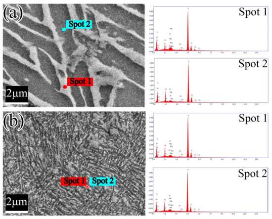 Figure 8 shows chemical element composition at different spots in the BM and WZ obtained by EDS. The EDS test spots are, respectively chosen at the white color area (β phase) and black color area (α phase) for the BM and WZ. The EDS spectrum distributions of the test spots are correspondingly displayed on the right side. Table 3 shows the ratio of elements at different test spots in the BM and WZ. Comparing the element percentage at the two spots of the BM, we can see there are many more elements of Mo, Nb and Cr at the β phase area than that at the α phase area. In addition, there is no Mo element and only slight Nb and Cr existing at α phase area. As shown in Table 3, at the BM β phase area, the weight percentage of Mo is even higher than that of Al, while the percentages of other elements with low content are slightly changed. It is known that Mo and Nb are stabilizing elements of eutectic-type β phase and that Cr is a stabilizing element of eutectoid-type β phase in titanium alloy. Therefore, it is also confirmed that the white area represents the β phase and the black area represents the α phase in the BM. In contrast, as shown in Table 3, the element percentages of the two spots (white and black color) in the WZ zone are almost the same. Even considering the accuracy of the test equipment, it could be found that the microstructure in the WZ cannot clearly distinguish the α phase from the β phase, and the microstructure in the WZ has changed from the coarse lamellar α phase and the residual β phase in the BM to the very fine α + β lamellar microstructure. The evolution of microstructure of weld zone of the IFW joint could be explained by the following: 1. As mentioned before, high force and heat during IFW process result in dynamic recrystallization and severe plastic deformation in WZ, giving rise to grain refinement. 2. The rapid cooling after the welding process causes stabilizing elements of β phase (such as Mo, Nb, and Cr) to be pinned in place and could not form aggregation. Moreover, the temperature of post welding annealing is lower than the β phase transition temperature, which also could not lead to diffusion and aggregation of stabilizing elements of β phase. Therefore, the β phase in weld zone clearly decreases when compared with that of the base metal. This would also explain the results of the decrease in the β phase and increase in the α phase proportion in the weld zone observed by EBSD.