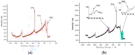XPS is used to analyze the chemical composition of samples, element state or binding state, and structure of the surface layer according to the electron binding energy of atoms and its changes [35]. XPS was performed using the PHI 5700 ESCA System (Physical Electronics). Figure 3 shows the XPS spectra of the sample before and after self-assembly. The element contents of C, O, and Si on the silicon surface before and after self-assembly are summarized in Table 1, where the center represents the bond energy value corresponding to the highest characteristic element peak, and AT% represents the percentage of each element in all measured elements.