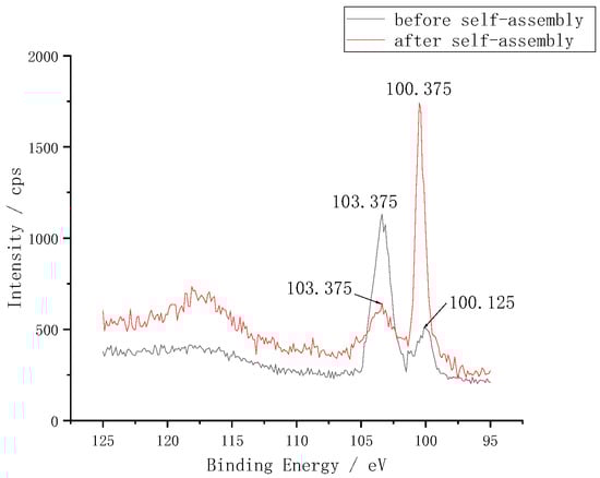 It can be seen that the Si2p peaks were divided into two groups; there were two forms of Si on the silicon surface. From the peak attribution table [36], it can be found that the Si at 100.125 eV was in an Si-Si bond, the Si at 103.375 eV was in Si-O, and the Si at 100.375 eV was in an Si-C bond [26,37]. After assembly, the peak value at 103.375 significantly decreased, the peak value at 100.125 almost disappeared, and the peak value at 100.375 obviously appeared. The ratio of the silicon peak area at 103.375 eV and 100.125 eV was about 4:1 before the reaction, indicating that the silicon surface was dominated by silicon dioxide, while the ratio of the silicon peak area at 103.375 eV and 100.375 was 1:4 after the reaction, indicating that the silicon bonded with carbon greatly increased. This was caused by the substitution of Si-Si and Si-O bonds for the Si-C bonds between the 1-octadecene molecules and the Si substrates. The above XPS spectrum analysis further proves that a self-assembled monolayer formed on the silicon substrate after the reaction, and the 1-octadecene molecules were covalently linked to the silicon surface.
