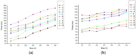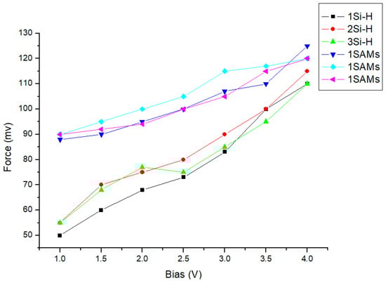 The nanofriction of the samples before and after self-assembly was measured using AFM (Dimension 3100) [39,40]. When the tip was scanned within a certain small range, the cross section of the friction image was observed, and the friction signal under each load was recorded. The load increased by specific amounts, and the curve of the relationship between the friction signal and the load was obtained. The experimental parameters were as follows: the scanning speed of the tip was 2.0 Hz, the scanning range was 1 m, and the load increased from 1.0 V, 0.5 V, to 4.0 V. The friction value of the silicon surface before and after assembly under each load was recorded. Each experiment measured the friction value at ten different points. The values with a large deviation were removed, and the other values were averaged for a total of ten sets of experiments. Origin software was used to draw the diagram, and the corresponding data were represented by the same symbol in the two diagrams, as shown in Figure 6. Then, the three groups of data that were close to each other were respectively taken from the friction signal data of the sample surface before and after assembly for comparison in the same coordinates. The solid line represents the Si-H surface before assembly, and the dashed line represents the SAMs surface after assembly, as shown in Figure 7.