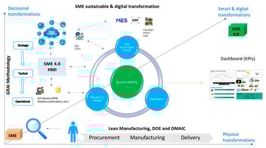 Industry 4.0 concepts have demonstrated their positive impact on the company performance improvement, but these concepts are not used sufficiently used in French SMEs. The reasons are numerous despite the necessity of company transformation for being competitive in the actual particular context. Indeed, the COVID pandemic and the geopolitical situation in Europe in addition to the competition of companies from emerging countries, create for SMEs a difficult economic situation that could not be overcome without a deep transformation including the reduction of production and logistics costs, and also the integration of a new societal, social and environmental philosophy. Requirements for the circular economy and ecological transformation cannot be excluded from the SMEs’ performance improvement. This paper presents a SME sustainable digital transformation methodology including the combination of lean manufacturing methodology with the DMAIC method, DOE method and GRAI methodology. A framework that has been elaborated for implementing the sustainable Industry 4.0 concepts is presented in this paper. The architecture of the intelligent system supporting the methodology has been shown, and a focus has been done on its decision aided tool. An example in a food cooking industry has been presented for illustrating the concepts, formalisms and tools of the sustainable digital methodology. The validation test on SMEs has to be continued in other domains for adjusting the global approach. This paper has shown the positive impact of the sustainable Industry 4.0 concepts on SME global performance. The main limitation is the need for systematic adaptation to the activity domain for ensuring the success of the methodology. Indeed, transformations have to be done in each domain for validating the concepts. The collaboration with the food cooking company by integrating the sustainability criterion involved participation of the company members and the company engagement in its processes digital transformation. The integration of sustainability as an Industry 4.0 criterion has been validated by the European Commission and called Industry 5.0. The final validation of the M. company performance improvement will be done in one year after the global transformation.