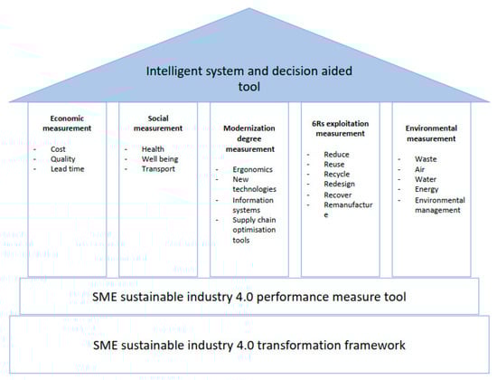 The performance measurement is organized around the Triple Bottom Line (TBL) which corresponds to environmental, social and economic criteria []. In [], sustainability is assessed through the TBL framework. Social sustainability involves equitable inclusion of human resources [,]. Environmental sustainability implies the preservation and survival of the ecological system []. Economic sustainability corresponds to an economic ability to consistently maintain a respectable level of increasing domestic productivity over a long period []. Other tools have also been developed and used for sustainable manufacturing performance measurement such as Analytic Hierarchic Process or lifecycle assessment [,]. In [], 7 factors and 67 variables have been defined and studied for measuring sustainable manufacturing of electric vehicles in India. These factors (technological, social, cultural, economic, political, geographical and environmental) could contribute to measurement of SMEs digital transformation.