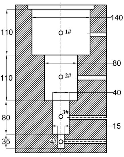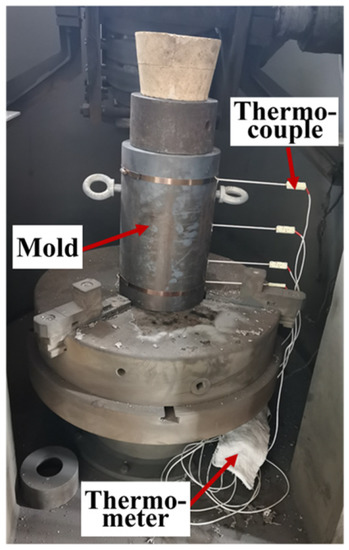 Due to the differences in ingot diameter and mold wall thickness, the heat dissipation rate during pouring was different, resulting in differences in the cooling rate of the ingot with different diameters. In order to study the effects of different cooling rates on the grain morphology and elemental segregation behavior of Fe-Mn-Al-C steel casting specimens, an experimental casting mold with diameter sizes of 140 mm, 80 mm, 40 mm and 15 mm was designed in this study which is shown in Figure 1. The temperature measurement position was the center of the ingot with different diameters as shown in Figure 1 (1, 2, 3 and 4). During the pouring process, a closed ceramic tube at one end was inserted into the specified position, and an S-type (platinum rhodium alloy) thermocouple was placed into the ceramic tube. The thermocouple was connected to a temperature recorder (SMT-X7), and the cooling curve of the different diameters of cast billet was recorded automatically. The cooling rate from the initial crystal formation to the complete crystallization was determined. The average cooling rate of different diameter ingots was calculated with the cooling curve. Experimental set-up of the casting mold, thermocouple arrangement, temperature measuring instrument and casting head is shown in Figure 2.