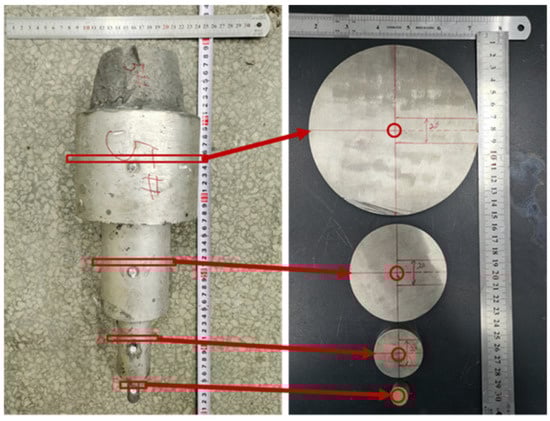 In this study, a 25 kg VIM/L vacuum induction furnace was employed to melt steel. The obtained stepped ingot is shown in Figure 3. Round disks with a thickness of 20 mm were cut near the temperature measurement positions at different diameters of the stepped ingots. The round disks were drilled at center position, and composition analysis of the drilling cuttings was carried out using ICP (inductively coupled plasma) and chemical titration. Then, an 8 mm specimen shown in Figure 3 was cut from the center of the stepped ingot. The specimens were polished and corroded first. A microscopic structure of the specimens was observed using a scanning electron microscope equipped with EBSD (electron back-scattering diffraction) (VEGA3). And after the re-grinding and polishing of the samples, composition analysis was performed in a scanning electron microscope equipped with EDS (energy dispersive spectroscopy).