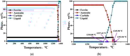 Calculated phase fractions in Fe-30Mn-10Al-1.1C steel solidification process: (a) overall phase diagram; (b) the partial magnified phase diagram.