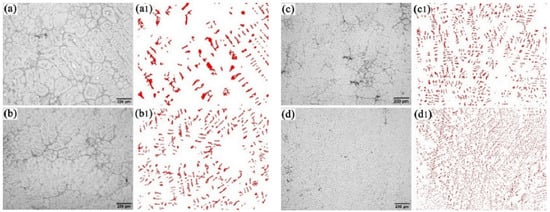 Microstructure at the center of the ingot with different diameters is given in Figure 6. The highlighted white phase in the figure is the ferrite phase and the gray phase is the austenitic phase. The results show that the size of ferrite phase decreases significantly and the distribution becomes denser with the cooling rate increasing. The ferrite phase was extracted in the samples under different cooling rates as shown in Figure 6(a1–d1). Area statistics were performed on the precipitated ferrite phase using Image-Pro Plus software, and the results are shown in Figure 7.
