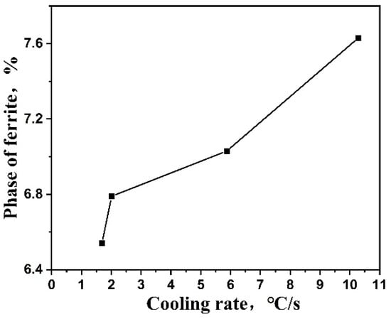 The results show that the area fraction of the ferrite phase increases with the cooling rate increasing: the ferrite phase content is 6.54%, 6.79% and 7.03% as the cooling rate is 1.69 °C/s, 2.01 °C/s and 5.87 °C/s, respectively. While the cooling rate is 10.28 °C/s, the ferrite phase content is 7.63%, which increases by 16.7% compared with the lowest cooling rate.