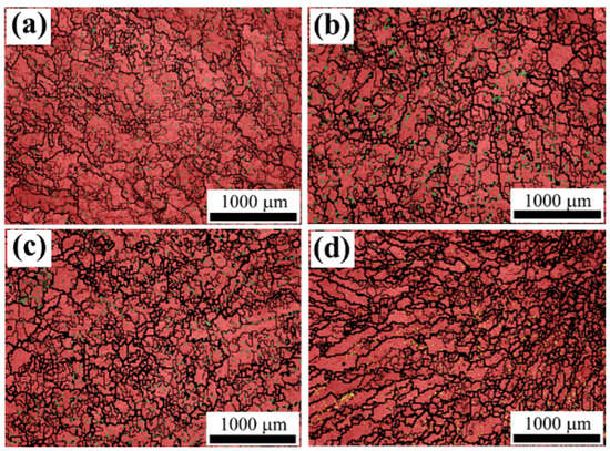 Figure 8 shows the grain organization pattern (EBSD) of different diameters for the Fe-Mn-Al-C steel ingot. Dimensional measurements were conducted of the austenitic phase grains. The results are given in Figure 9.