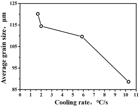 - As the cooling rate increases, the austenitic phase grain size in the isometric crystal region at the center of the ingot decreases significantly. While the cooling rate increases from 1.69 °C/s to 10.28 °C/s, the average grain size of the austenitic phase transforms from 120 μm to 89 μm, which is a 26% reduction.