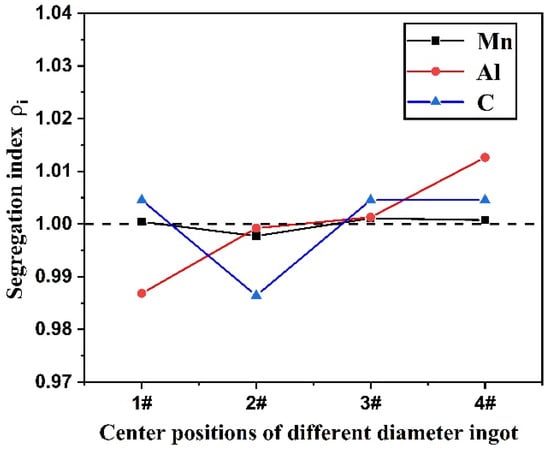 Here, ρi is segregation index, Ci is the element content of i point in Fe-Mn-Al-C steel ingot, and C0 is the average content of the element at each point. ρi > 1 indicates that the element segregates positively at this experimental point, and ρi < 1 indicates that the element segregates negatively at the point in the ingot.