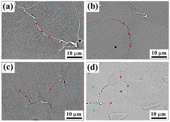 Element content test location on grain boundaries (red points) and in the austenitic phase matrix (blue points) with different cooling rates: (a) 1.69 °C/s; (b) 2.01 °C/s; (c) 5.87 °C/s; (d) 10.28 °C/s.
