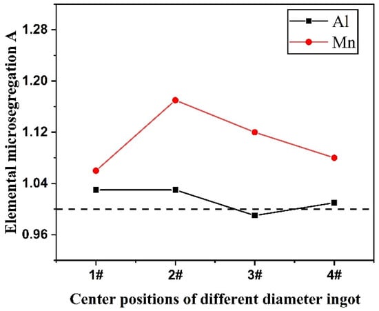 The extent of elemental micro-segregation on grain boundaries and in austenite grains at ingot centers with different diameters is given in Figure 12. From the figure it can be seen that Al content at the grain boundary is higher than that in the austenite grain as the cooling rate is low. With the increase in cooling rate, the Al micro-segregation value is close to 1, and the micro-segregation extent decreases. The Mn content at the grain boundary is invariably higher than that in the austenite grain. With the increase in cooling rate, Mn micro-segregation shows a trend of increasing first and subsequently decreasing. Combined with Figure 7 and Figure 9, it can be deduced that the nucleation rate of steel melt increases with the cooling rate increasing; meanwhile, the size of the grains in the steel decreases and the number of grains increases. Therefore, the distribution difference in elements on the grain boundary and in the grain reduces. Hence, it can be concluded that the increase in cooling rate can promote the elemental distribution to be more uniform on the grain boundary and in the austenite grain, and the micro-segregation of Al and Mn can be effectively prevented.