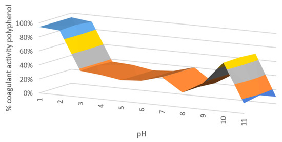On the one hand, the results specify that acidic pHs favor flocculation and coagulation, even when we used the lowest concentration of polyphenols. On the other hand, we found that the condition for producing the highest removal percentage corresponds to the combination of 3.9 mg GAE/L with pH 2.5. It is an indication that there is no dose-dependent behavior and that the most determining influence includes the pH of the sample rather than the added concentration.