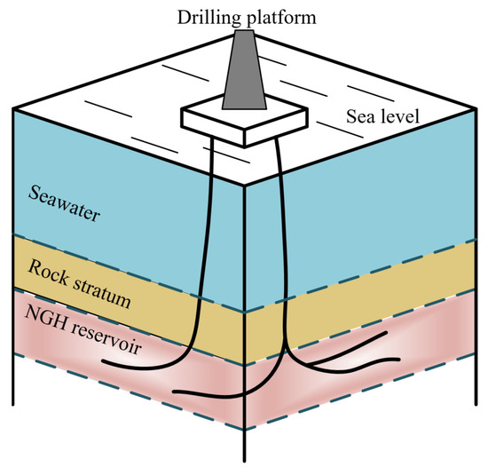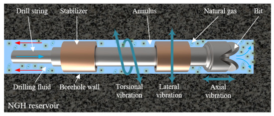 All countries in the world attach great importance to the exploration and development of natural gas hydrates in order to respond to energy emergencies. The stability condition for NGH is low temperature and high pressure. These conditions can exist at shallow depth below the seabed. The decomposition of NGH can happen when the nature of the formation or vibration changed. Then, the natural gas can volatilize from the stratum [7,8,9]. The properties of the drilling fluid will change and cause irregular vibration of the drill string, which may eventually lead to unwanted vibration of the drill string. Conversely, the vibration of the drill string will change surroundings and aggravate the decomposition of hydrates. Meanwhile, severe vibration can easily induce serious drilling accidents such as formation collapse. As an important part of drilling, the drill string is a key factor in determining the success of the drilling process [10,11]. During the drilling process, the drill string is subjected to a large sudden change of stress caused by the alternating load, and it often fails prematurely. Drill string failure has always been a difficult problem in international oilfield development. In China, there are at least 500 drill string failure accidents in oil and gas fields every year, with direct economic losses of more than 40 million yuan. SPE/Drilling Engineering published an article in May 1992, in which drilling conditions of five vertical wells in West Africa from 1987 to 1988 were introduced. The depths of these five wells are between 2591–3962 m. A total of 66 fracture accidents occurred during the drilling process, on average, 13.2 times for each well and an average loss of 20,000 dollars per accident [12,13]. Offshore exploitation of gas hydrate is more complex than onshore exploitation of oil and gas. Natural gas will be incorporated into the drilling fluid in the annulus (the space between the drill string and the wellbore). A schematic diagram of natural gas hydrate drilling is shown in Figure 2.
