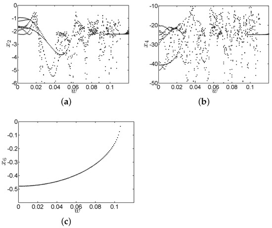 According to the formula, the law of the variation of the amplitude of the drill string in three directions with the angular velocity is obtained, as shown in Figure 4. With the increase of angular velocity (which has been converted into a dimensionless quantity), the lateral bifurcation diagram shows an upward trend. However, the y-axis of the image is negative; so, the lateral amplitude decreases, and the amplitude is closer to zero than that obtained for a smaller angular velocity. The reason is that the angular velocity is reflected in the stiffness term in the equation. The higher the angular velocity, the greater the stiffness of the lateral vibration of the system and the smaller the amplitude. The axial and torsional vibrations of the system experience a process from multiple periodic motion to almost periodic motion and, then, to periodic motion with the increase of angular velocity. Meanwhile, the amplitudes of axial and torsional vibrations are smaller (closer to the zero point of the y-axis) when the angular velocity approaches zero. With the increase of the angular velocity, the amplitude becomes larger and more complex. When the angular velocity exceeds 0.11, the two amplitudes return to near zero, and the vibration tends to be stable.