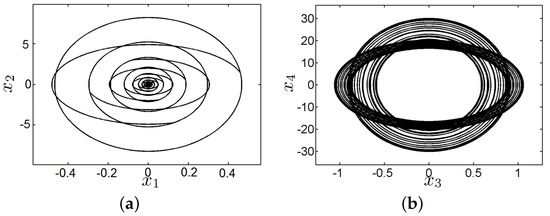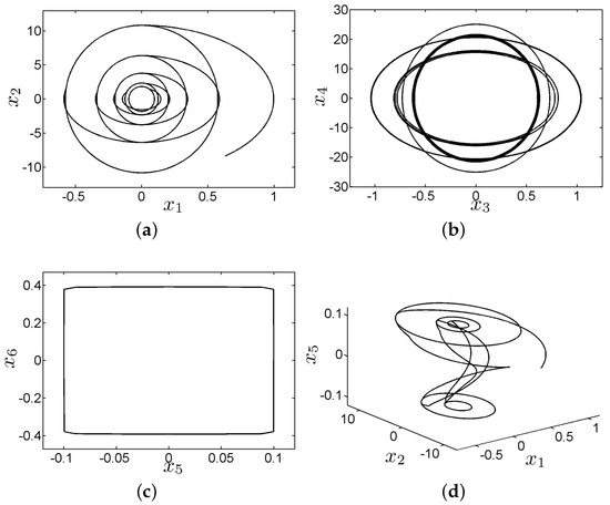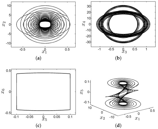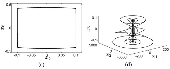 The system response is shown in Figure 5 when the angular velocity increases to 0.06. The lateral vibration of the system has a jump phenomenon. Thus, there is rub-impact in the system. The jump phenomenon directly causes a jump to the axial and torsional vibration of the system. It can be seen from the three-dimensional phase diagram that the friction phenomenon of the system in the axial motion will make the system jump from one limit cycle to another limit cycle, and there are rich nonlinear dynamic phenomena in the system. Severe vibration can easily lead to wellbore instability and NGH reservoir anomalies.