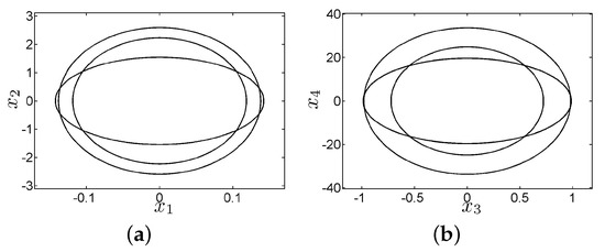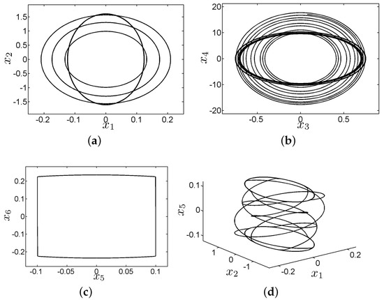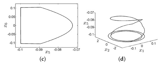 The system response is shown in Figure 6 when the angular velocity increases to 0.11. The response is a triple-periodic motion, the vibration is simplified, and the amplitude of vibration is reduced. It can be seen from the phase diagram of lateral vibration that this is the rub-impact of the system, which is manifested as unilateral rub-impact. The transition from bilateral to unilateral rub-impact of the system is the main reason why the vibration form of the system is simplified and the amplitude is reduced. The results show that if the vibration is complex and the amplitude is large, the vibration of the drill string can be made more stable by increasing the rotational speed, and the probability of drill string damage or borehole wall will inevitably be reduced.