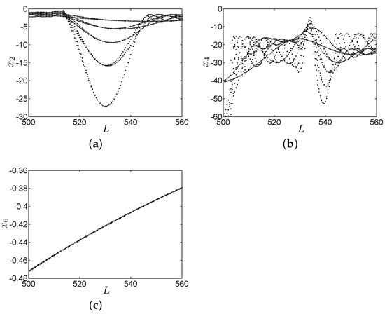 The length of the drill string is different for different well depths, which is also an important parameter that affects the system response. The bifurcation diagrams of the system in three directions are shown in Figure 7. It can be seen from the figure that the amplitude of the lateral vibration is relatively stable, but the extreme value of the lateral amplitude changes sharply. The torsional amplitude is relatively large when the length of the drill string is between 520 m and 530 m. When the length increases from 530 m to 540 m, the torsional amplitude is still relatively large, but there is a decreasing trend, and the axial vibration amplitude gradually increases. In this section, the length of the drill string in the range 515 m–560 m is simulated in order to investigate the effect of the length on the dynamic characteristic of the drill string.