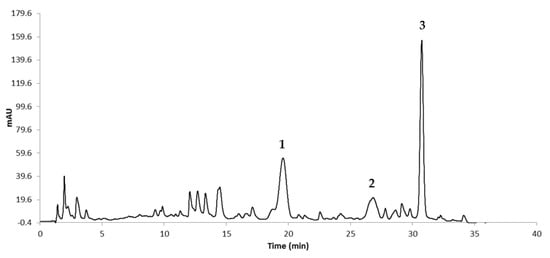 RP-HPLC profile (at 280 nm). Main compounds present in methanolic extract from grape pomace: (1) Malvidin₋3₋O-glucoside; (2) Malvidin-3-O-acetyl-glucoside; (3) Malvidin-3-O-coumaroyl-glucoside.