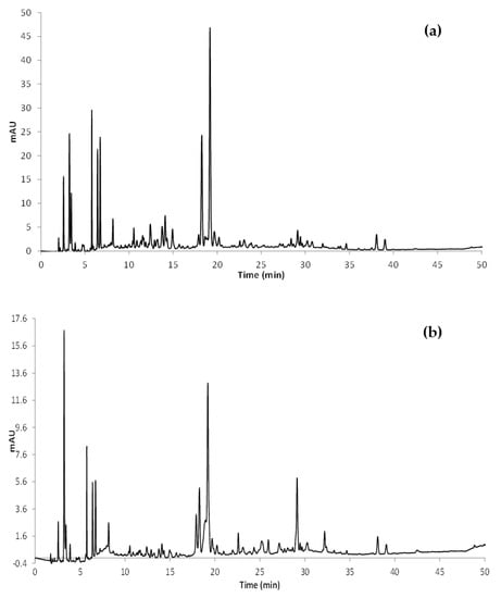 As can be seen in the chromatograms (Figure 3), aqueous extract showed a slightly similar polyphenolic profile than that of the methanolic extract, although the compounds present in AE are found in a higher concentration (Figure 3a). This could be due to the extraction of monomeric compounds, since they are more easily solubilized. However, one main difference can be found in the methanolic extract with a peak present near t = 30 min, attributed to malvidin-3-O-coumaroyl-glucoside. Both the methanolic extract (Figure 3b) and cake methanolic extract (Figure 3c) present a polyphenolic profile of a very similar nature, although in a lower concentration in the cake methanolic extracts. This indicates the possibility that the ZHE efficiently extracted the compounds that were soluble in the methanolic solvent.