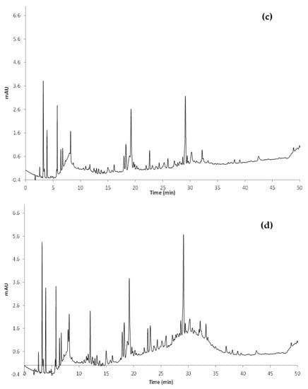 RP-HPLC chromatogram (at 280 nm). (a) First stage aqueous extract, water₋acetic acid 5% (v/v); (b) Second stage methanolic extract, methanol₋acetic acid 5% (v/v);CONT. RP-HPLC chromatogram (at 280 nm). (c) Cake methanolic extracts, methanol-acetic acid 5% (v/v); (d) cake acetone extracts, 80% acetone-20% acidified water (v/v).