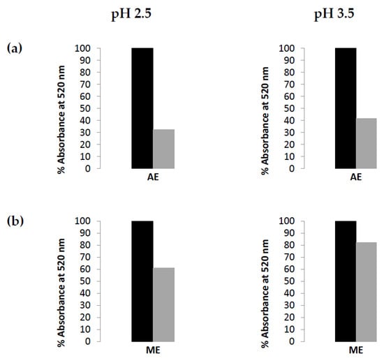 For AE, at pH 2.5, 32.3% of the pigments were resistant to sulfite bleaching (Figure 4a), while 67.7% of the compounds lost their color. At pH 3.5, 41.6% of the pigments maintained their color and the remaining 58.4% became colorless. The loss of color indicates that those pigments have the C4 position of the anthocyanin free.
