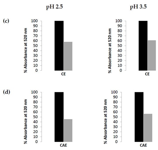 Absorbance values (520 nm) at pH values 2.5 and 3.5 (a) first stage aqueous extracts “AE”; (b) second stage methanolic extracts “ME”. Black columns indicate absorbances before sulfite bleaching, while gray columns indicate absorbances after sulfite bleaching; CONT. Absorbance values (520 nm) at pH values 2.5 and 3.5 (c) cake methanolic extracts “CE”; (d) cake acetone extracts “CAE”. Black columns indicate absorbances before sulfite bleaching, while gray columns indicate absorbances after sulfite bleaching.