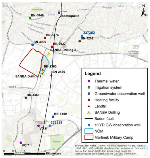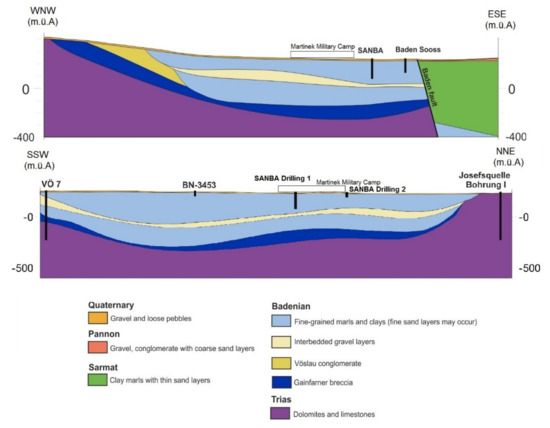 - Gegenhuber, N. Interpretation der Faziellen und Hydrogeologischen Verhältnisse des Raumes Baden/Bad Vöslau Aufgrund von Bohrlochmessungen und Seismischen Profilen. Magisterarbeit; Montanuniversität Leoben: Leoben, Austria, 2007. [Google Scholar]