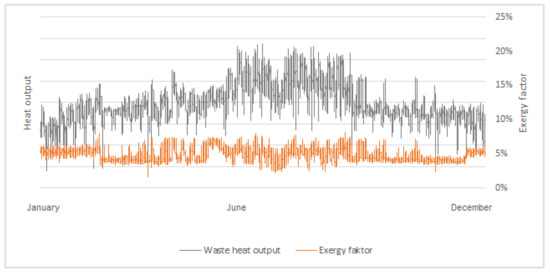 | Plant | Low Temperature Waste Heat Compared to Energy Input [%] | Temperature Level [°C] | Exergy Share of Waste Heat [%] |