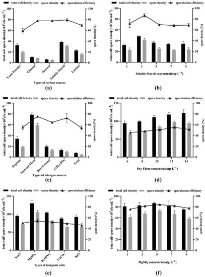 Among the five carbon sources (yeast extract, glucose, sucrose, soluble starch and lactose) with a concentration of 5 g·L−1, the total cell density and spore density of soluble starch were the highest, followed by those of yeast extract, lactose, glucose and sucrose. However, in terms of sporulation efficiency, soluble starch, glucose and lactose were the highest, followed by lactose and yeast extract (Figure 1a).