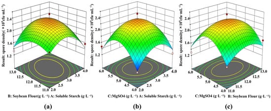 According to the BBD, a total of 15 experiments were performed, and their results are shown in Figure 2 and Table 2. Figure 2a shows the effects of soluble starch, soybean flour and their concentrations on the spore density when the addition of MgSO4 was 5 g·L−1. The minimum value of spore density was 1.33 × 109 CFU·mL−1 when the soluble starch was 2 g·L−1 and soybean flour was 13 g·L−1. When the concentrations of soluble starch increased from 2 g·L−1 to 4 g·L−1, and soybean flour increased from 11 g·L−1 to 13 g·L−1, the spore density in the fermentation broth showed a trend of first increasing and then decreasing. When soluble starch was at 3 g·L−1 and soybean flour at 12 g·L−1, the spore density reached the maximum. The surfaces in Figure 2b, c reflect the similar interactions between soluble starch and MgSO4, and soybean flour and MgSO4, respectively.