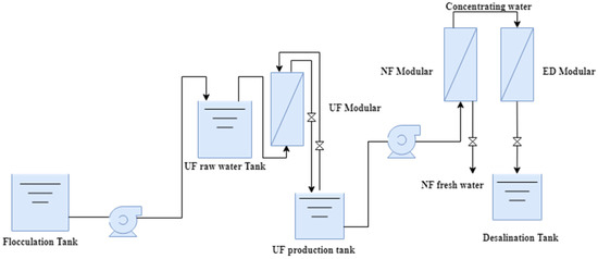The experimental process flow diagram is shown in Figure 1, consisting of flocculation sedimentation, UF, NF, and ED. The flocculation effects of the different flocculants and their dosage on the tannery wastewater were investigated in the pretreatment stage. In the UF process, different types of UF membranes were used to select the most suitable UF membrane for this experiment, and the effects of operating pressure and time on UF were investigated. The average turbidity of the UF produced water was 0.5 NTU, where the overall removal rate reached more than 95%, and COD could be reduced to a certain extent.