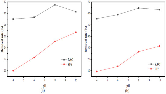 The type of flocculant was the key to determining the effect of chemical flocculation on wastewater treatment. Figure 2 show the influence curves of different chemical flocculants on the chroma, turbidity, and COD. When the flocculation time was 30 min, the same dose of flocculant and coagulant aid were used for flocculation at different pH values. As shown in Figure 2a,b, PAC improved the turbidity and chroma, and the overall removal effect of COD was better than PFS as a flocculant. When PAC was used as a chemical flocculant, the flocculation effect was the best when pH = 8, the turbidity removal rate was 65%, the COD removal rate was 31.5%, and the chroma removal rate was 30%.