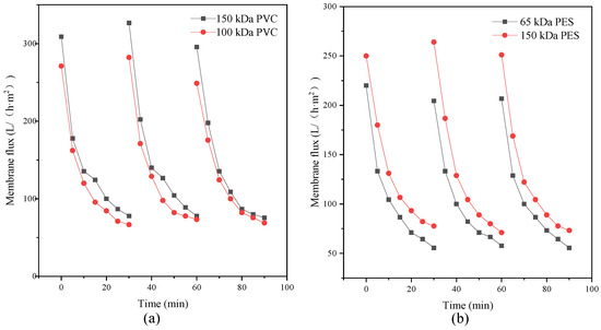 Variations in membrane flux with time: (a) PVC and (b) PES.