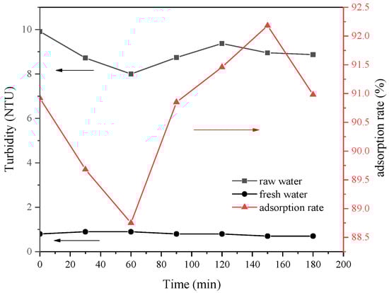 However, when the operating pressure was too large, it also led to the rupture of membrane filaments, which affected the UF results. To make the UF membrane run efficiently and smoothly, 0.2 MPa was found to be the most suitable operating pressure for the membrane, because compared with 0.1 MPa and 0.15 MPa, 0.2 MPa had a larger internal and external pressure difference. As the transmembrane pressure difference increased, the membrane flux also increased. The subsequent determination of UF water turbidity and removal rate is shown in Figure 7.