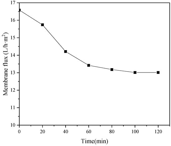 As shown in Figure 8, there were three main stages in the variation of membrane flux with time. First, 0–30 min was the beginning stage of NF, the surface of the NF membrane was relatively loose, and the membrane flux was also the largest for a period of time. At later times, the freshwater membrane flux decreased rapidly due to the gradual formation of a concentration polarization layer. Over the next 30–70 min, the membrane flux continued to show a downward trend; however, the decline rate decreased significantly. This was due to the decrease caused by the gradual deposition and adsorption of some solutes on the surface of the NF membrane.