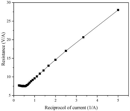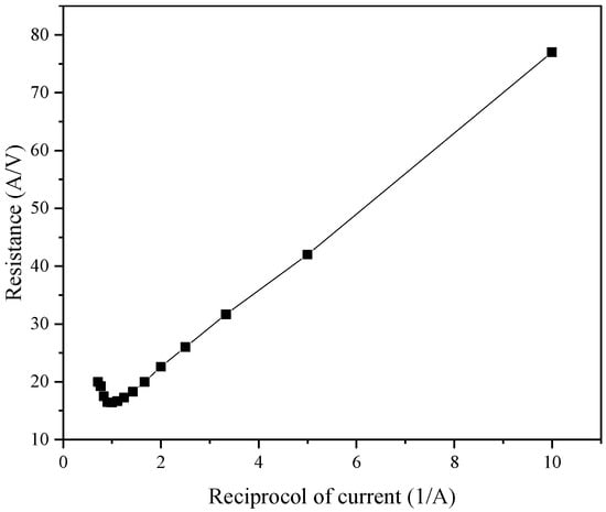 One of the most important parameters in ED applications involves the limiting current. Because the current affects the performance of the ED system, the selection of the limiting voltage and limiting current is very important, and the limiting current will be affected by the plate and membrane specifications. To measure the limiting current, commonly used methods include the voltage–current method, the current-effluent pH value method, and the resistance–current method. After comprehensive consideration, in this experiment, we adopted the resistance–current method to measure the limiting current, and 22 pairs of common anion and cation exchange membranes were used.
